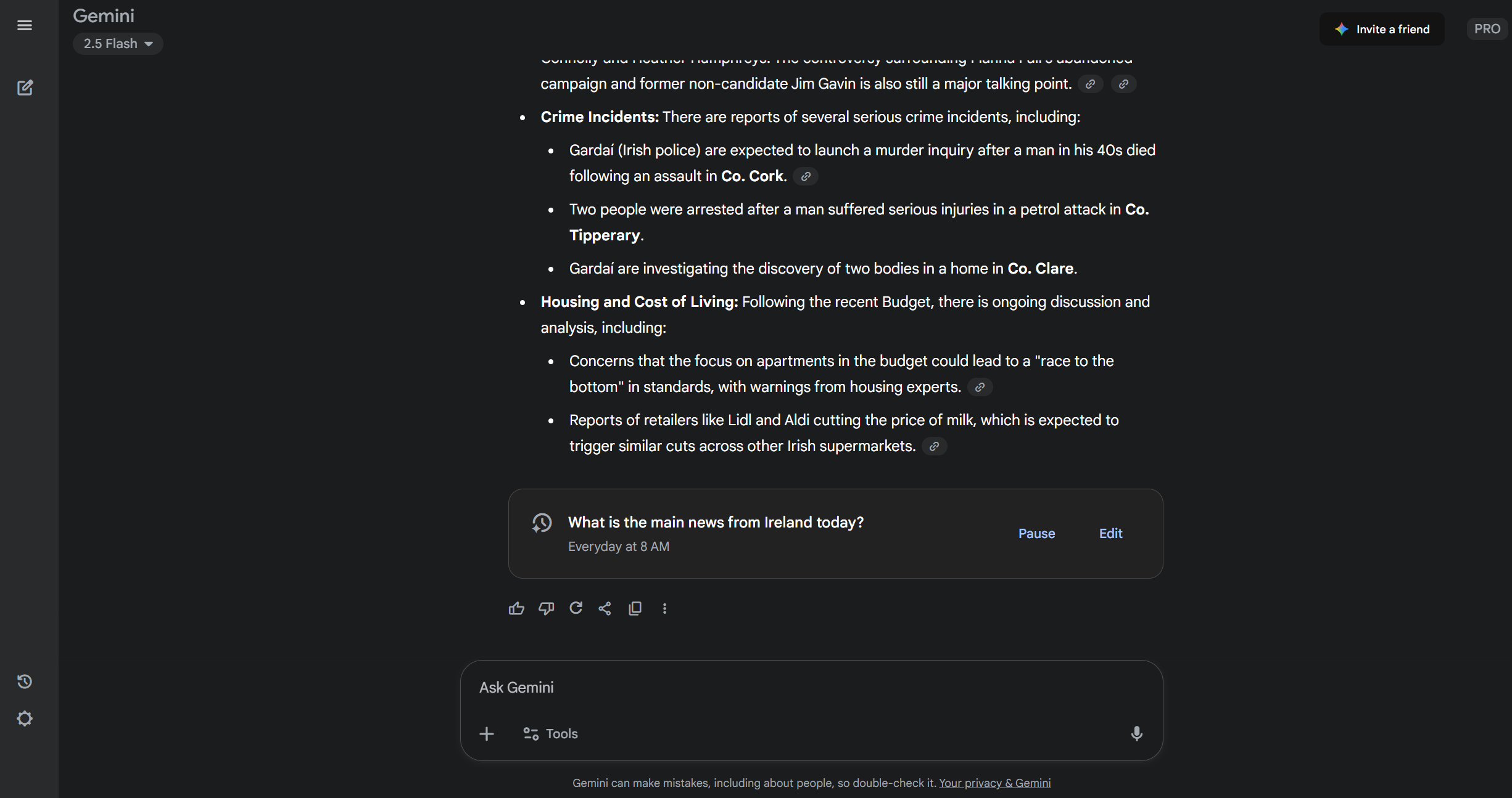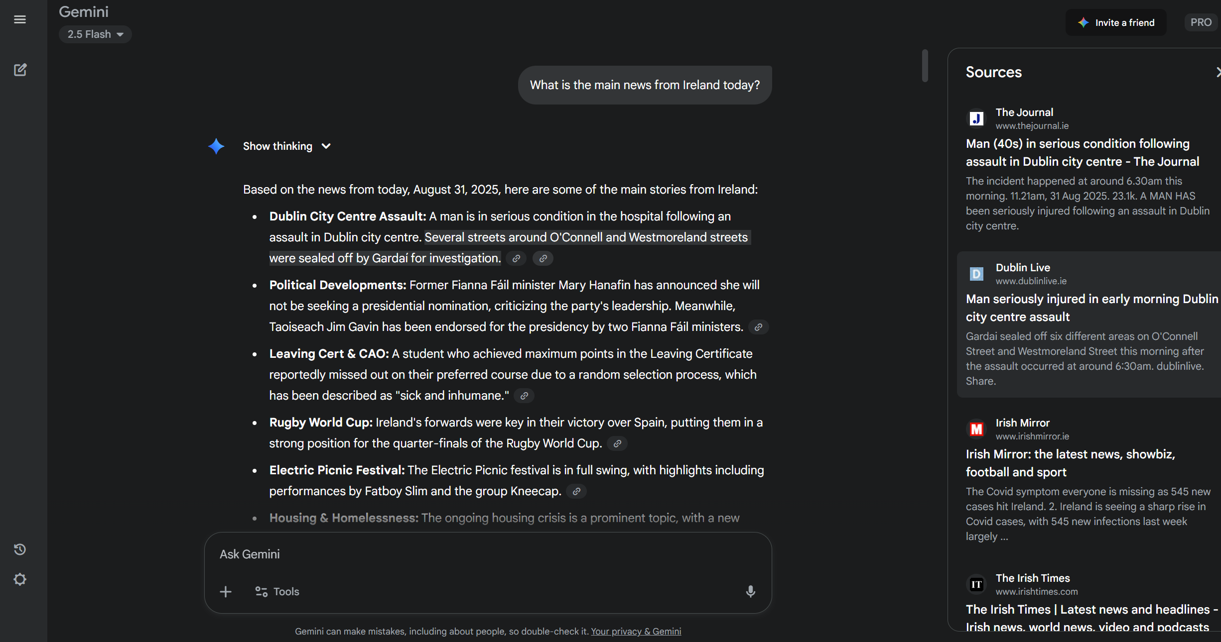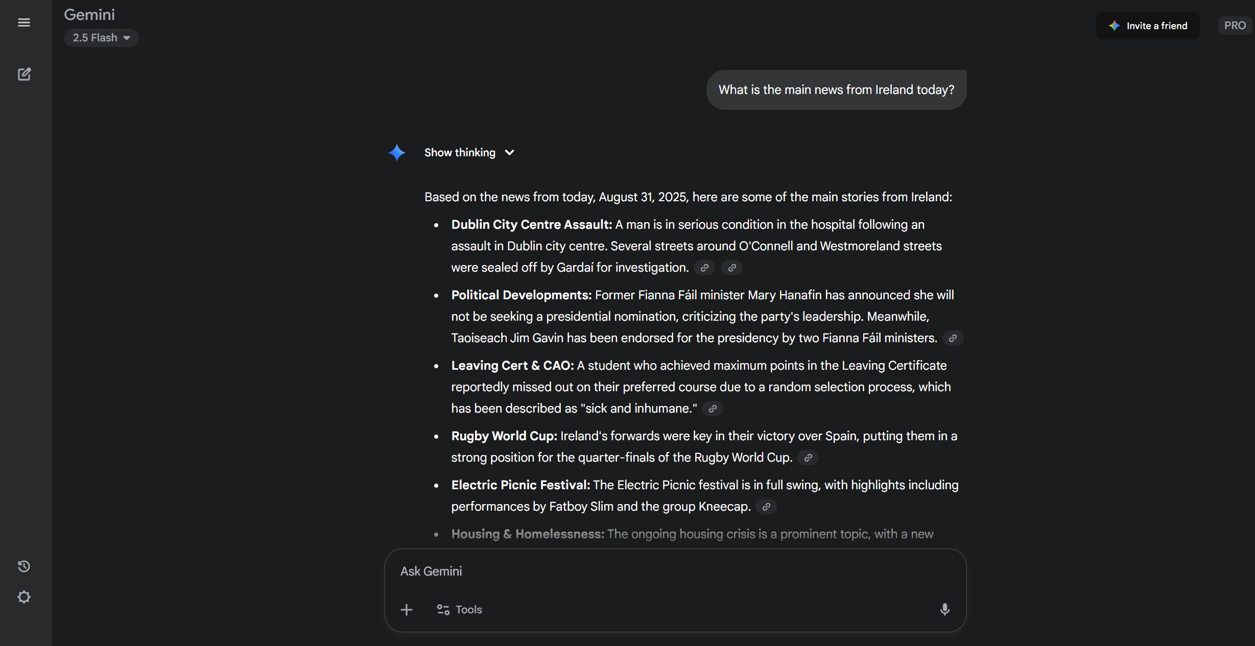I decided to use this to provide me with a summary of the news in Ireland today, here is my prompt and the results for the first time I ran it: “What is the main news from Ireland today?”