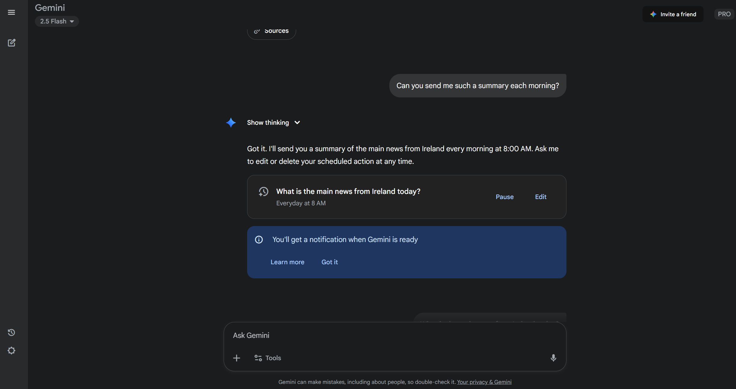 Next up, let’s ask Gemini to run the same prompt daily and share the results with me: “Can you send me such a summary each morning?”: